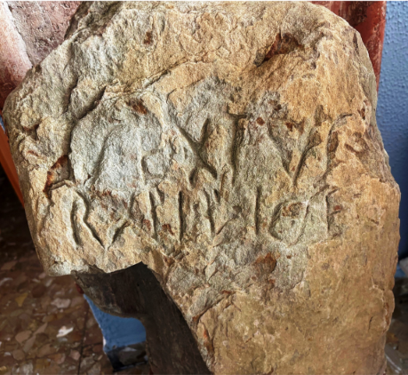 La S se ha grabado con mucha inclinación hacia adelante; la X es asimétrica; la R casi cursiva; la C tiene una curvatura irregular; la E, con barras oblicuas; y la F se inscribió con un trazo vertical y una línea paralela superior más corta.