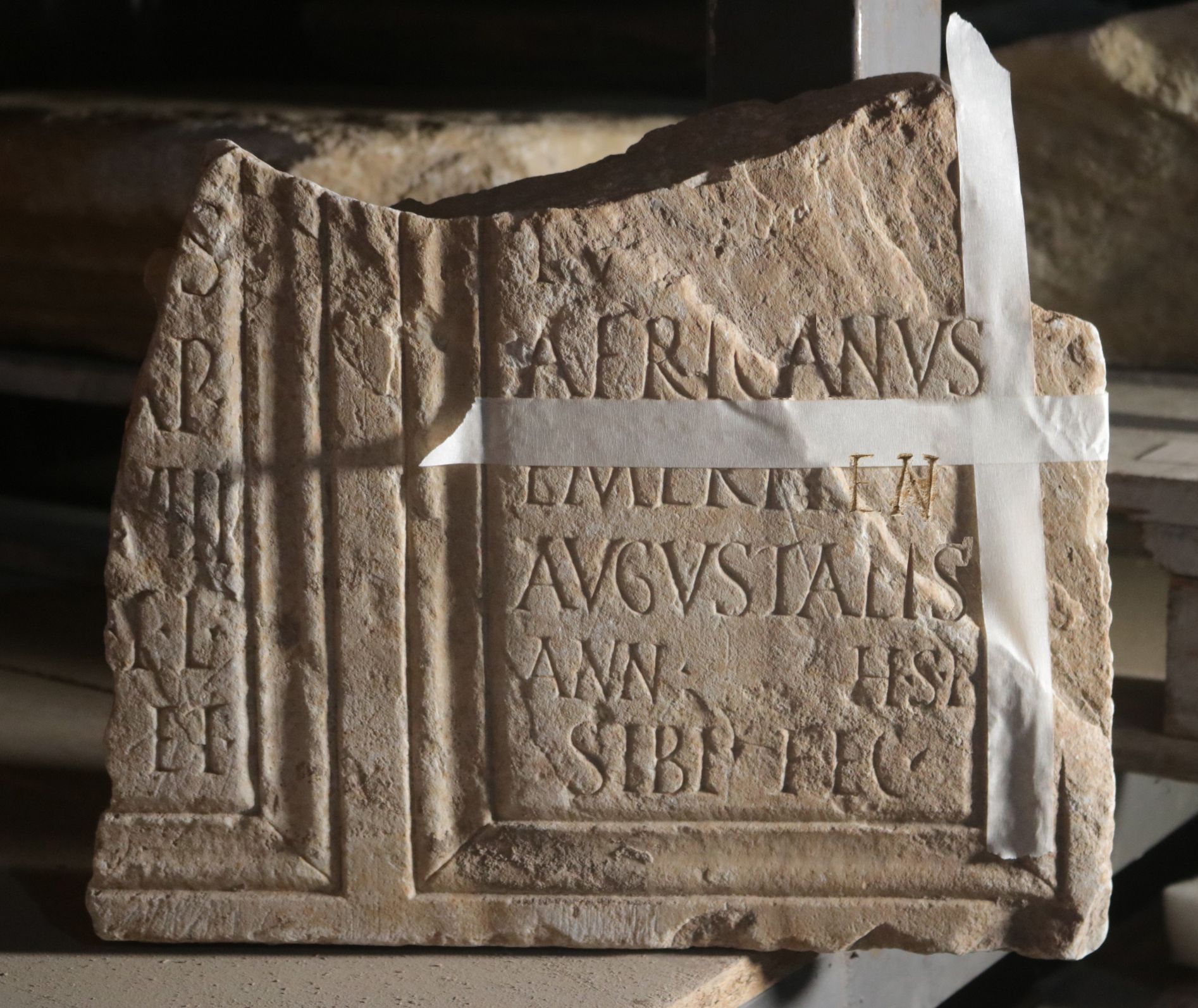 Cartela derecha: ¿Tito?... Africano, emeritense, augustal, de ¿? años. Aquí yace. Lo hizo para sí mismo.